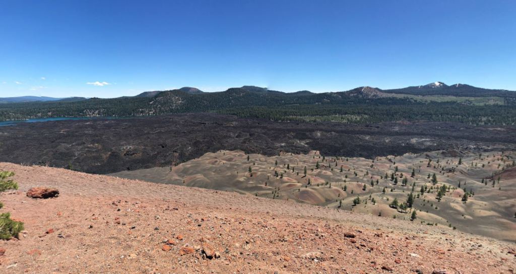 View from the Cinder Cone, looking out over the Painted Dunes and Fantastic Lava Beds with Snag Lake in the background