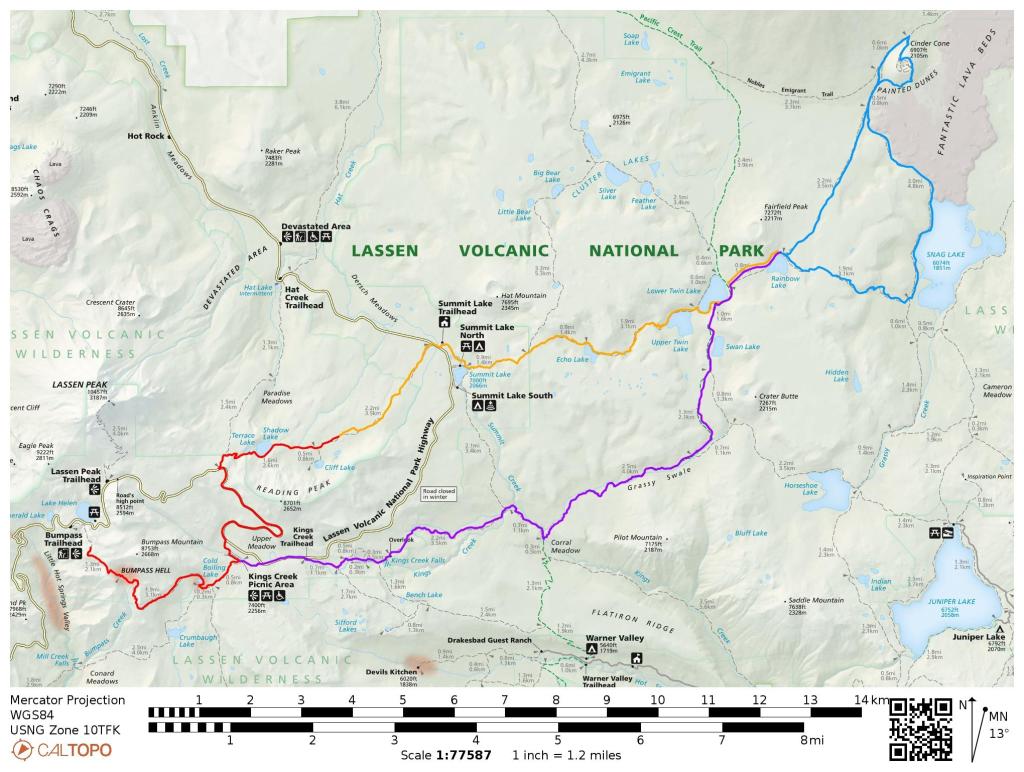 Trip Overview: This ~38 mile route traverses Lassen Volcanic National Park. Along the way you hike to the top of the Cinder Cone, pass by solidified lava flows and multicolored dunes, and walk through a large hydrothermal area. +/- 7,000 feet of elevation over the course of this trek with a peak elevation of 8,400 feet. Other highlights include volcanic peaks, meandering rivers, alpine meadows, and several lakes. The majority of the images here are from a trip in mid September.