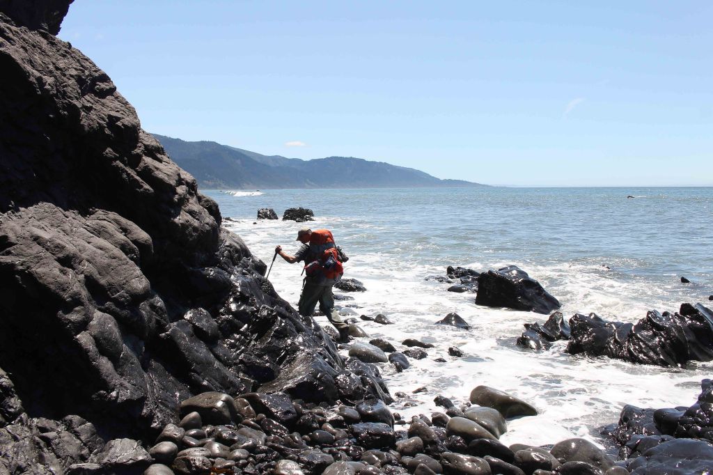 Day 3 is the longest hike of the itinerary at over 11 miles. The day starts with a modest climb up to Big Flat, a section of the trail where you hike along a Jeep Trail above the shore. You then pass by Miller Flat before dropping back down to the shore. At this point, you must navigate a ~4 mile section of trail between the south end of Miller Flat and Gitchel Creek, which is impassable at high tide. After Gitchel Creek, you are free to hike at your leisure without thinking about tides until you reach the end of the trek at Black Sands Beach.