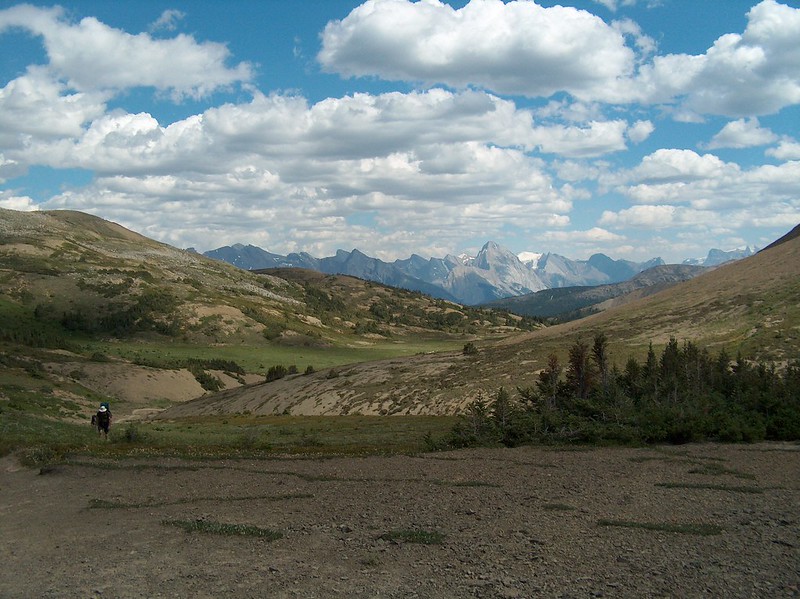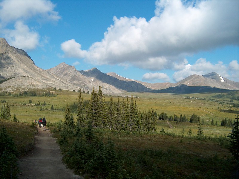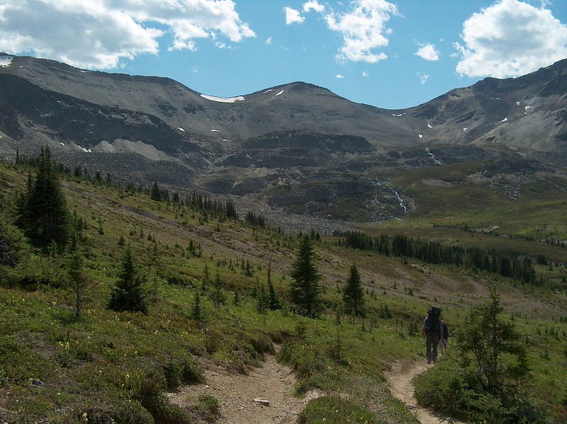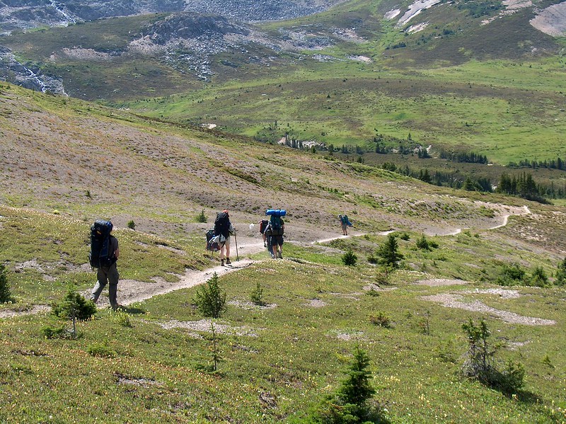 Backpackers on the Skyline Trail, descending from Little Shovel Pass down into the Snowbowl area of Jasper National Park