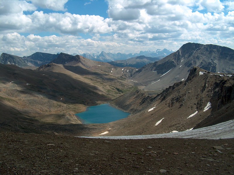 View looking down on Curator Lake from atop The Notch, along the Skyline Trail in Jasper National Park
