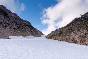 View looking up at the Spider Glacier. You hike over the glacier and reach Spider Gap after ~0.7 miles (credit: John Strother)